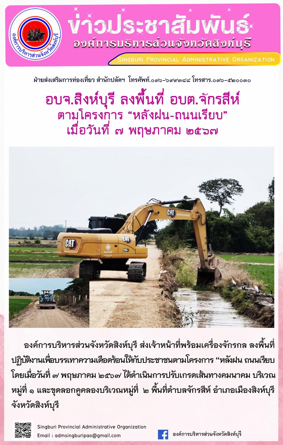 อบจ.สิงห์บุรี ลงพื้นที่ อบต.จักรสีห์ ตามโครงการ "หลังฝน - ถนนเรียบ" [7 พฤษภาคม 2567]