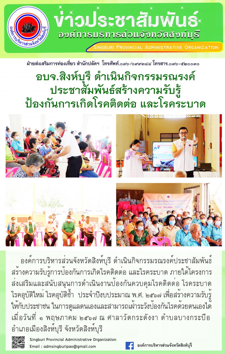 อบจ.สิงห์บุรี ดำเนินกิจกรรมรณรงค์ ประชาสัมพันธ์สร้างความรับรู้ป้องกันการเกิดโรคติตต่อ และโรคระบาด [1 พฤษภาคม 2567]