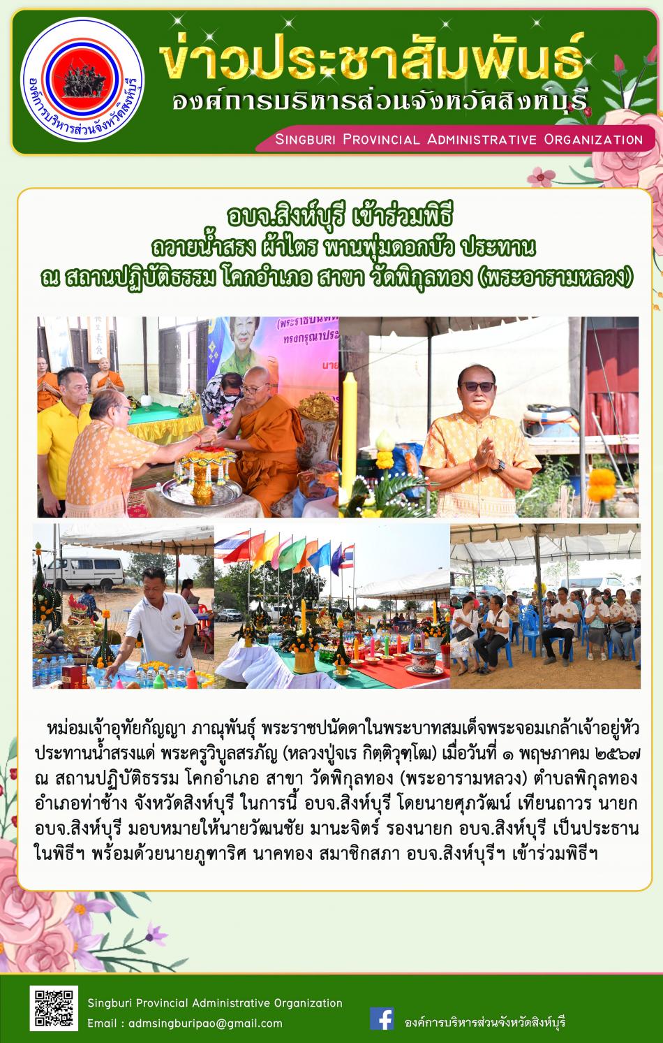 อบจ.สิงห์บุรี เข้าร่วมพิธีถวายน้ำสรง ผ้าไตร พานพุ่มดอกบัว ประทาน ณ สถานปฏิบัติธรรม โคกอำเภอ สาขา วัดพิกุลทอง(พระอารามหลวง) [1 พฤษภาคม 2567]