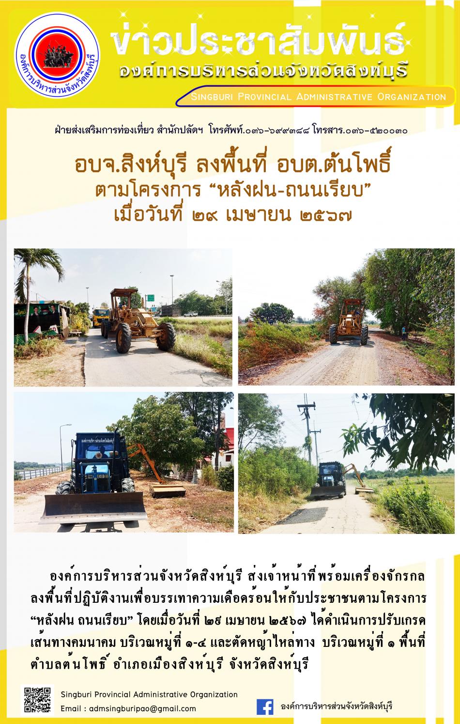 อบจ.สิงห์บุรี ลงพื้นที่ อบต.ต้นโพธิ์ ตามโครงการ "หลังฝน - ถนนเรียบ" [29 เมษายน 2567]