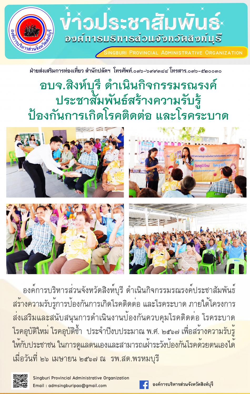 อบจ.สิงห์บุรี ดำเนินกิจกรรมรณรงค์ ประชาสัมพันธ์สร้างความรับรู้ป้องกันการเกิดโรคติตต่อ และโรคระบาด [26 เมษายน 2567]