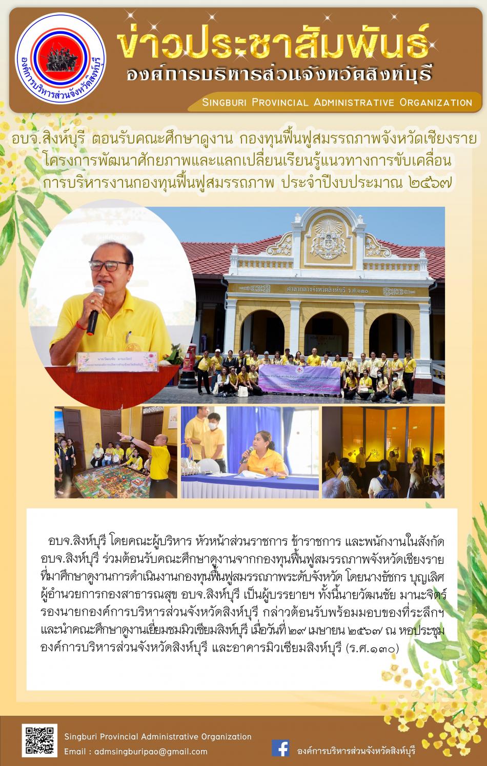 อบจ.สิงห์บุรีต้อนรับคณะศึกษาดูงาน กองทันฟื้นฟูสมรรถภาพจังหวัดเชียงราย โครงการพัฒนาศักยภาพและเเลกเปลี่ยนเรียนรู้แนวทางขับเคลื่อนการบริหารงานกองทุนฟื้นฟูสมรรถภาพ ประจำปีงบประมาณ 2567 [29 เมษายน 2567]