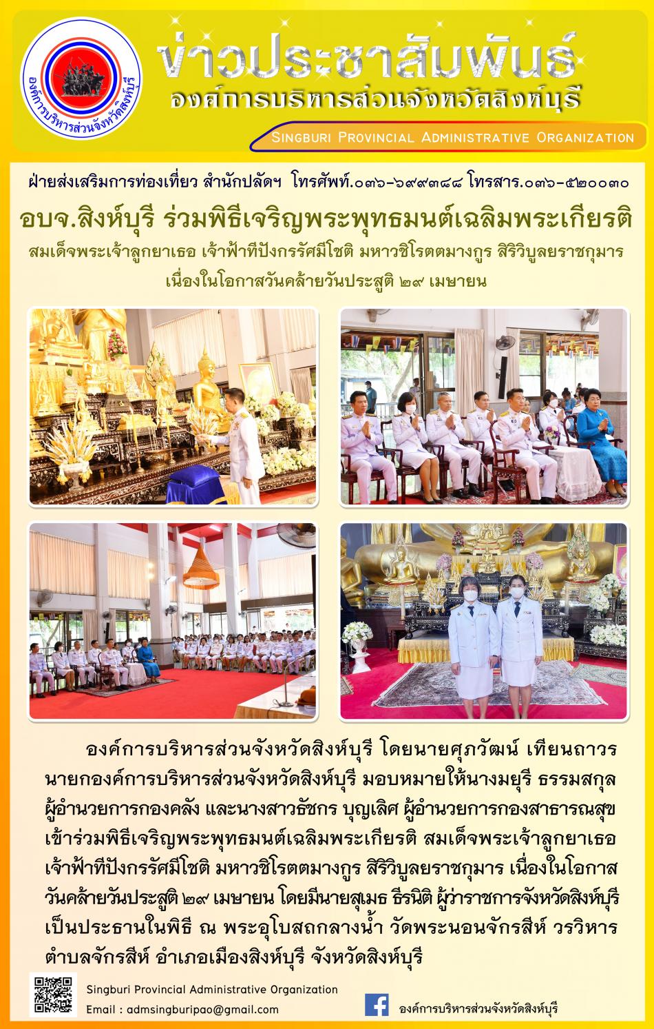 อบจ.สิงห์บุรี ร่วมพิธีเจริญพระพุทธมนต์เฉลิมพระเกียรติ สมเด็จพระเจ้าลูกยาเธอ เจ้าฟ้าทีปังกรรัศมีโชติ มหาวชิโรตตมางกูร สิริวิบูลราชกุมาร เนื่องในโอกาสวันคล้ายวันประสูติ 29 เมษายน [29 เมษายน 2567]