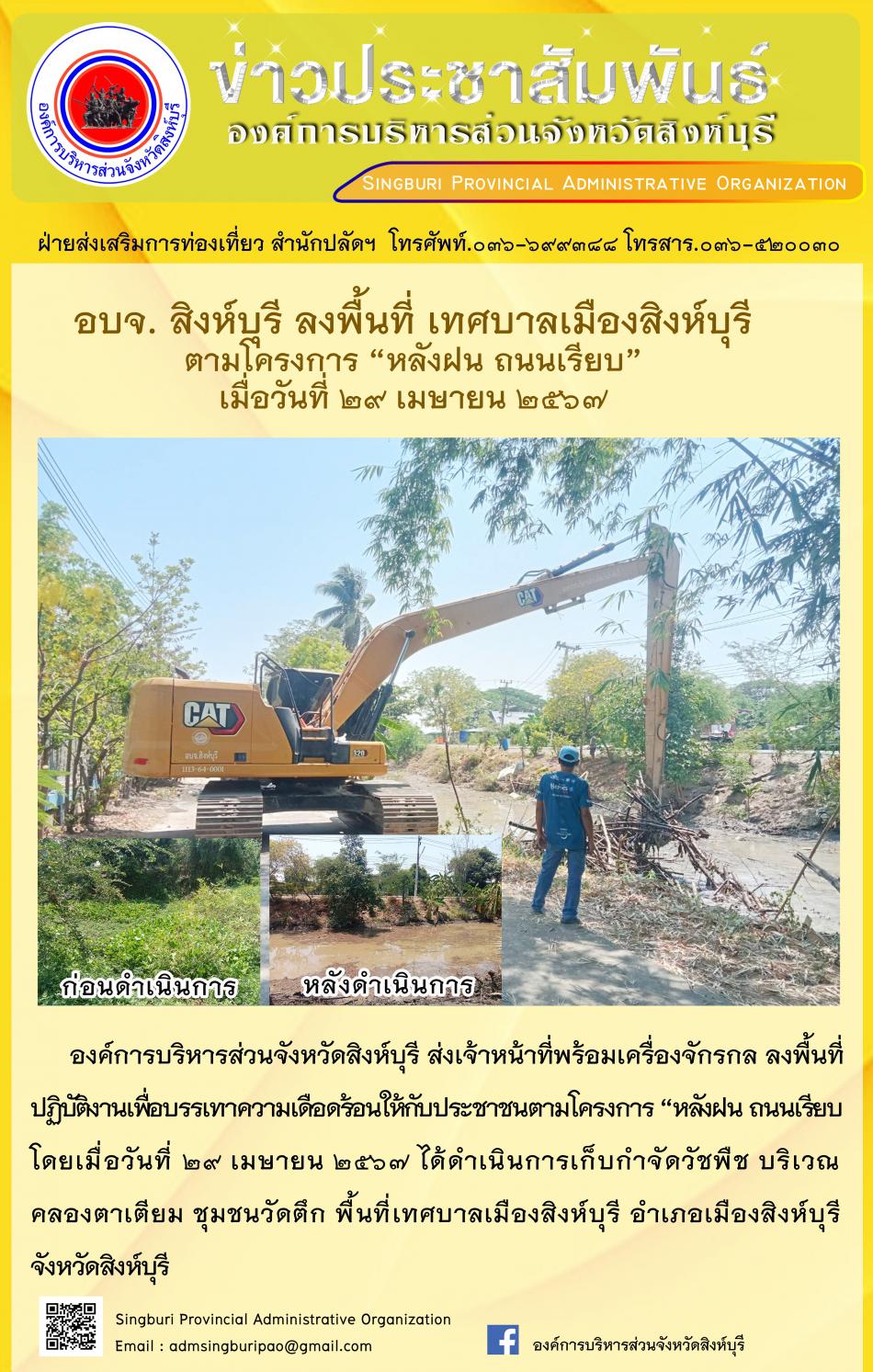 อบจ.สิงห์บุรี ลงพื้นที่ เทศบาลเมืองสิงห์บุรี ตามโครงการ "หลังฝน - ถนนเรียบ" [29 เมษายน 2567]
