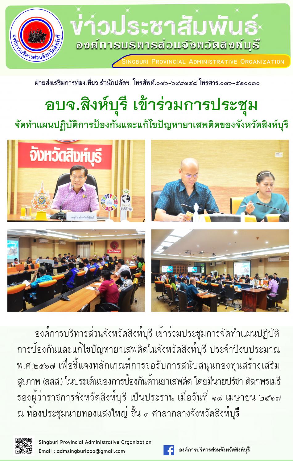 อบจ.สิงห์บุรี เข้าร่วมประชุมจัดทำแผนปฏิบัติการป้องกันและแก้ไขปัญหายาเสพติดของจังหวัดสิงห์บุรี [17 เมษายน 2567]