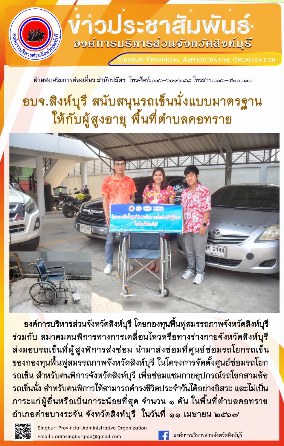 อบจ.สิงห์บุรี สนับสนุนรถเข็นนั่งแบบมาตรฐาน ให้กับผู้สูงอายุ พื้นที่ตำบลคอทราย [11 เมษายน 2567]