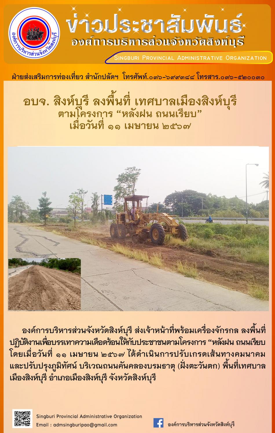 อบจ.สิงห์บุรี ลงพื้นที่ เทศบาลเมืองสิงห์บุรี ตามโครงการ "หลังฝน - ถนนเรียบ" [11 เมษายน 2567]