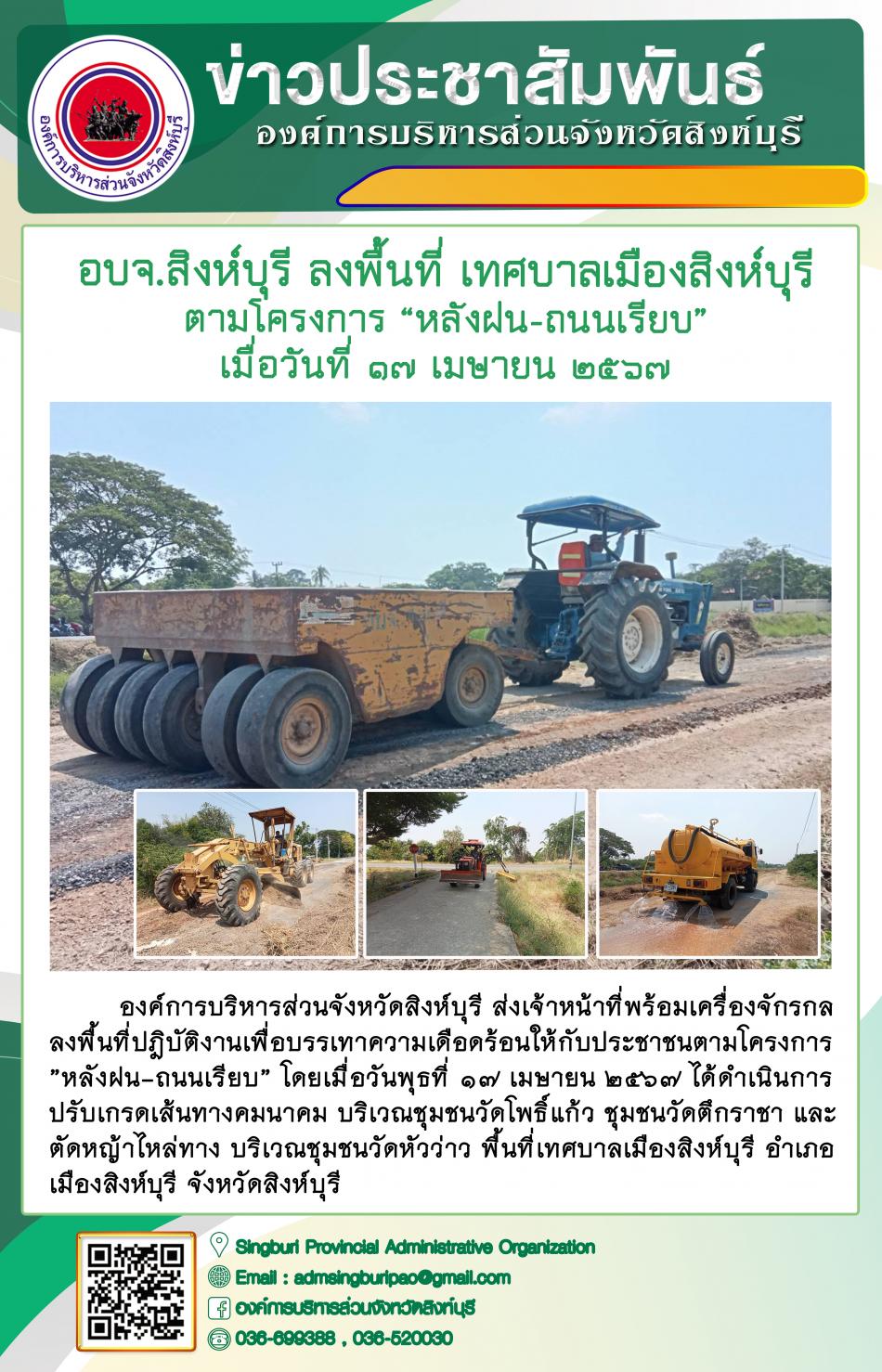 อบจ.สิงห์บุรี ลงพื้นที่ เทศบาลเมืองสิงห์บุรี ตามโครงการ "หลังฝน - ถนนเรียบ" [17 เมษายน 2567]