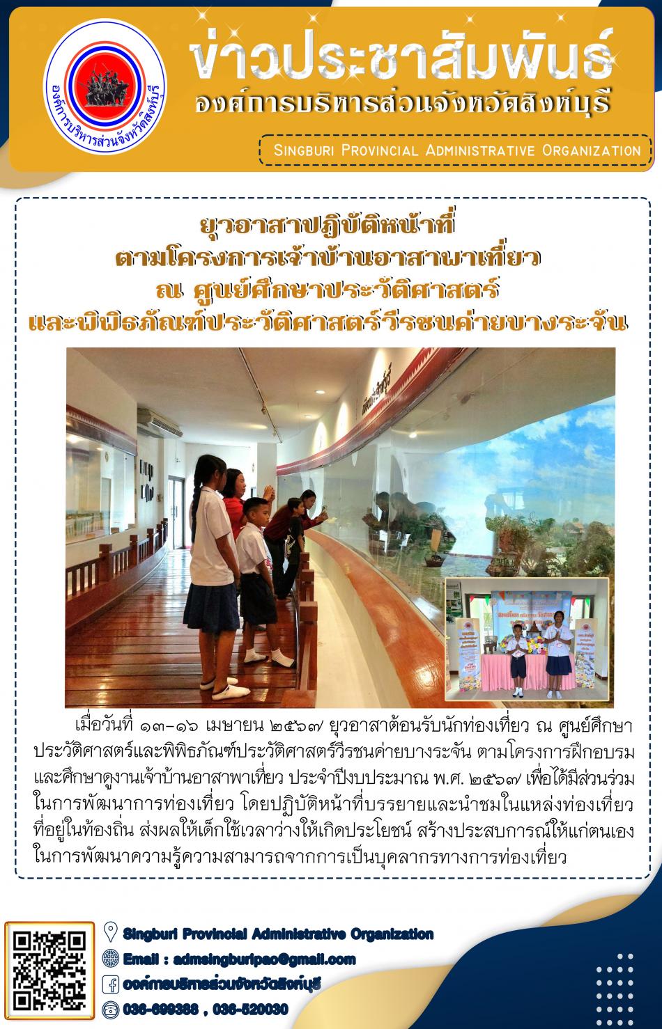 ยุวอาสา ลงพื้นที่ปฏิบัติหน้าที่ ตามดครงการเจ้าบ้านอาสาพาเที่ยว ณ ศูนย์ศึกษาประวัติศาสตร์และพิพิธภัณฑ์ประวัติศาสตร์วีรชนค่ายบางระจัน [16 เมษายน 2567]