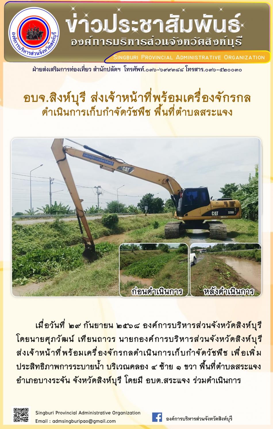 อบจ.สิงห์บุรี ส่งเจ้าหน้าที่พร้อมเครื่องจักรกล ดำเนินการเก็บกำจัดวัชพืช พื้นที่ตำบลสระแจง [29 กันยายน 2568]
