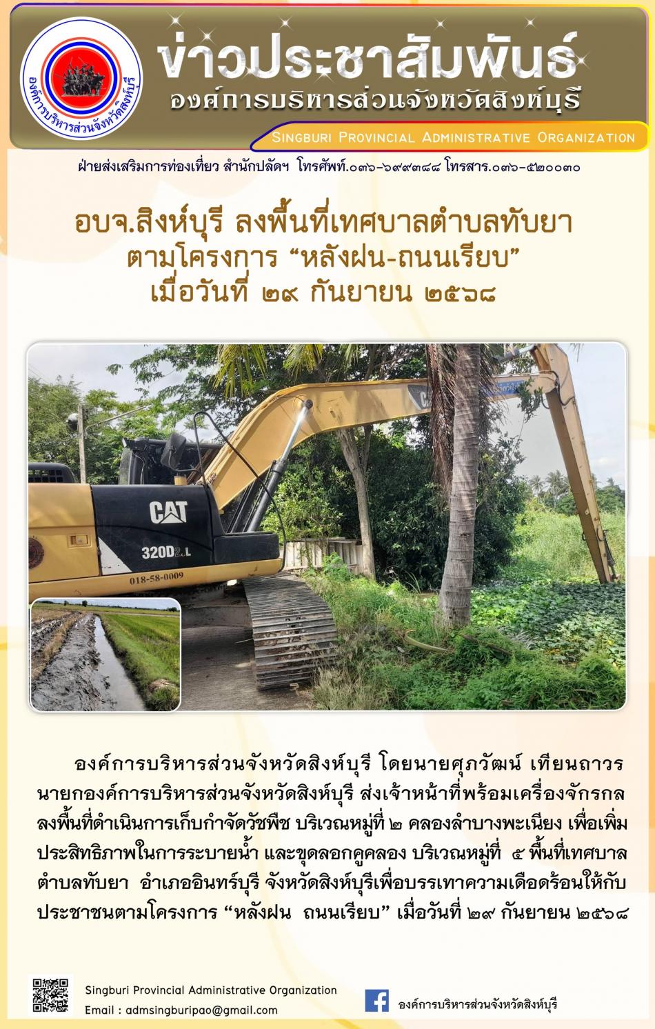 อบจ.สิงห์บุรี ลงพื้นที่ ตำบลทับยา ตามโครงการ “ หลัง ฝน- ถนนเรียบ” [29 กันยายน 2568]