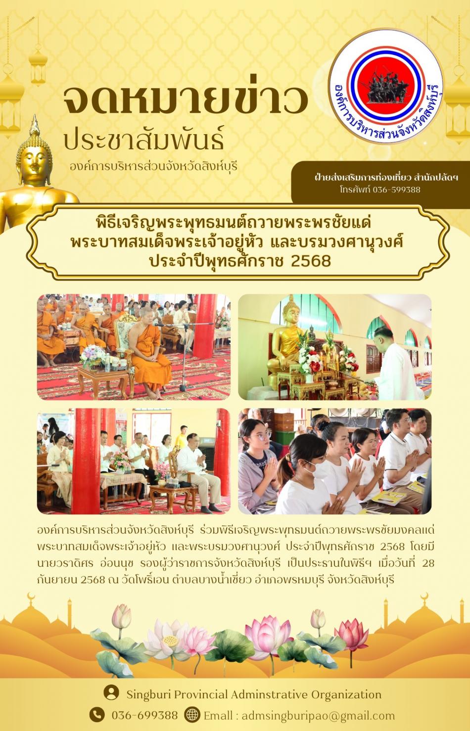 อบจ.สิงห์บุรี ร่วมพิธีเจริญพระพุทธมนต์ถวายพระพรชัยแด่พระบาทสมเด็อพระเจ้าอยู่หัว และบรมวงศานุวงศ์ ประจำปีพุทธศักราช 2568 [28 กันยายน 2568]