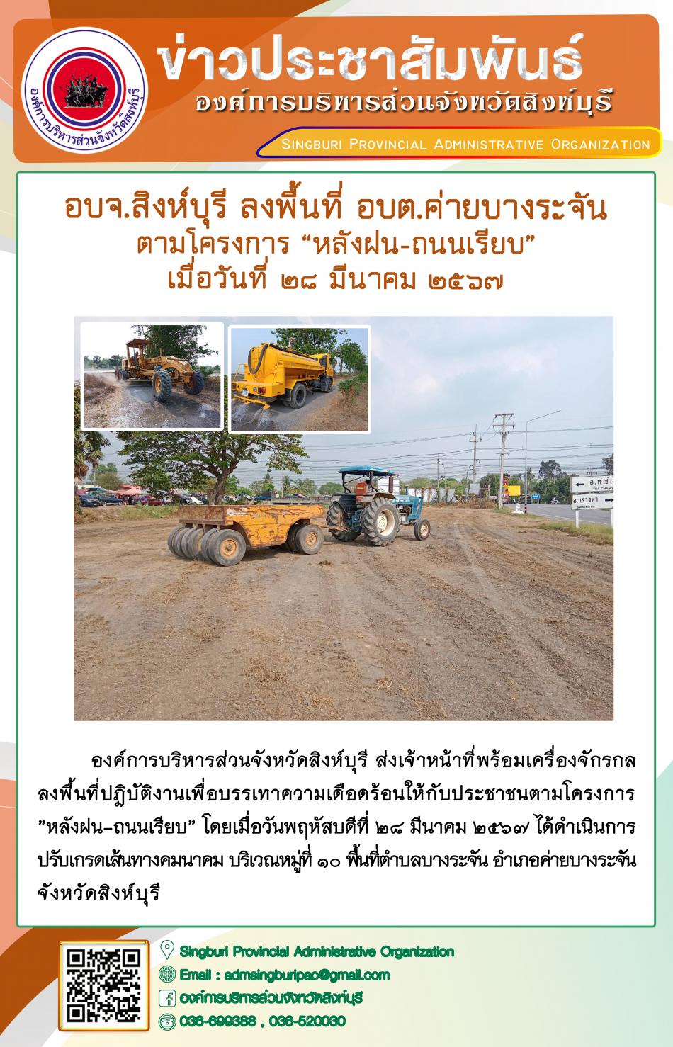 อบจ.สิงห์บุรี ลงพื้นที่ อบต.ค่ายบางระจัน ตามโครงการ "หลังฝน - ถนนเรียบ" [28 มีนาคม 2567]