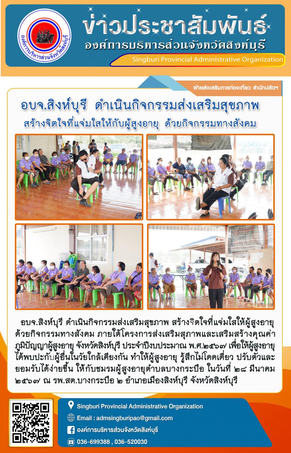 อบจ.สิงห์บุรี ดำเนินกิจกรรมส่งเสริมสุขภาพ สร้างจิตใจที่แจ่มใสให้กับผู้สุงอายุ ด้วยกิจกรรมทางสังคม [28 มีนาคม 2567]