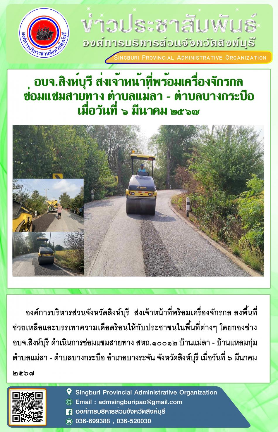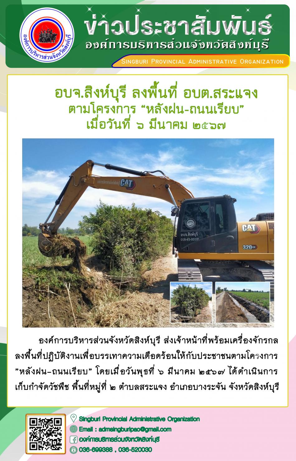 อบจ.สิงห์บุรี ลงพื้นที่ อบต.สระแจง ตามโครงการ "หลังฝน - ถนนเรียบ" [6 มีนาคม 2567]