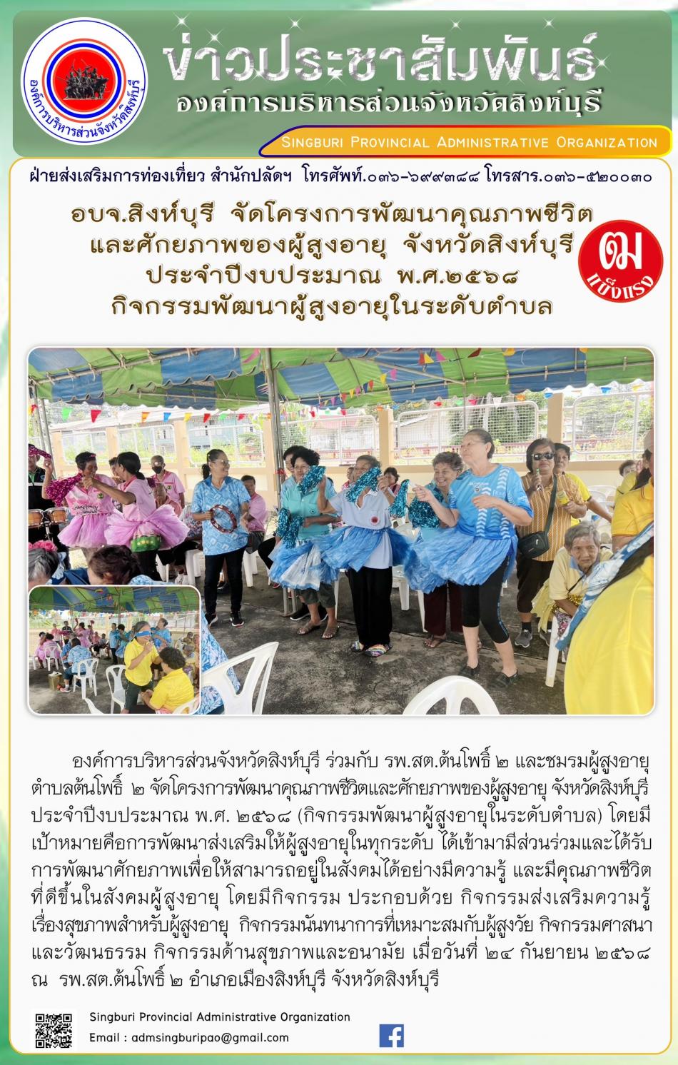 อบจ.สิงห์บุรี จัดโครงการพัฒนาคุณภาพชีวิตและศักยภาพของผู้สูงอายุ จังหวัดสิงห์บุรี ประจำปีงบประมาณ พ.ศ. 2568 กิจกรรมพัฒนาผู้สูงอายุระดับตำบล [24 กันยายน 2568]