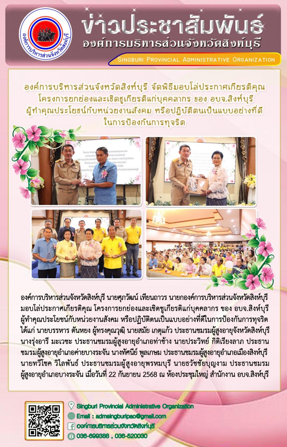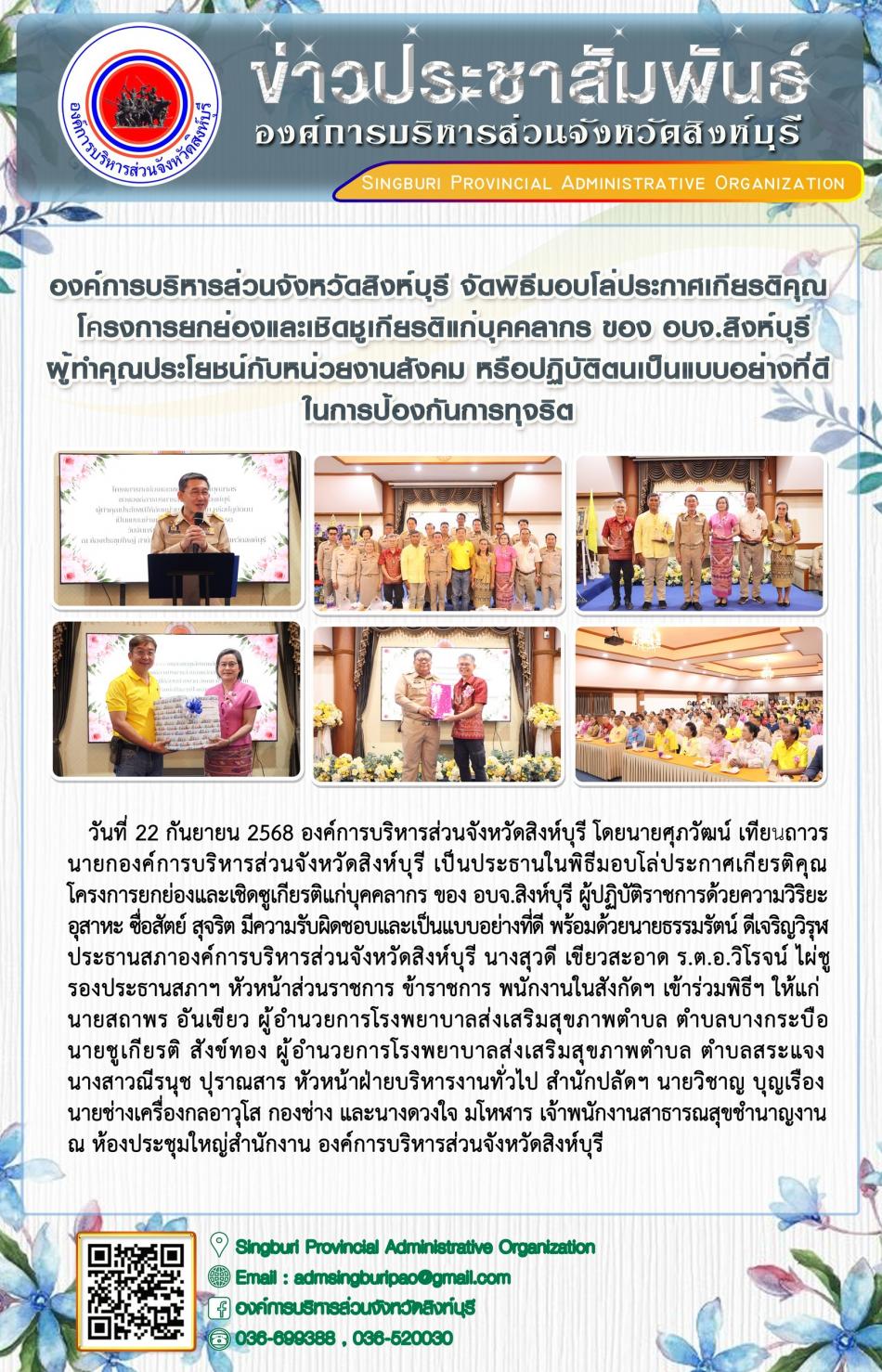 องค์การบริหารส่วนจังหวัดสิงห์บุรี จัดพิธีมอบโล่ประกาศเกียรติคุณ โครงการยกย่องและเชิดชูเกียรติแก่บุคลากร ของ อบจ. สิงห์บุรี ผู้ทำคุณประโยชน์ กับหน่วยงานสังคม... [22 กันยายน 2568]