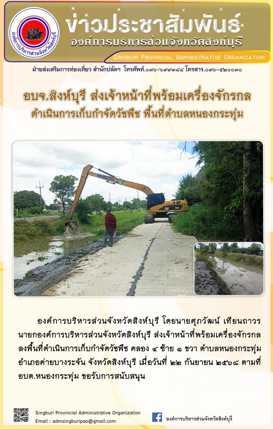 อบจ.สิงห์บุรี ส่งเจ้าหน้าที่พร้อมเครื่องจักรกล ดำเนินการเก็บกำจัดวัชพืช พื้นที่ตำบลหนองกระทุ่ม [22 กันยายน 2568]
