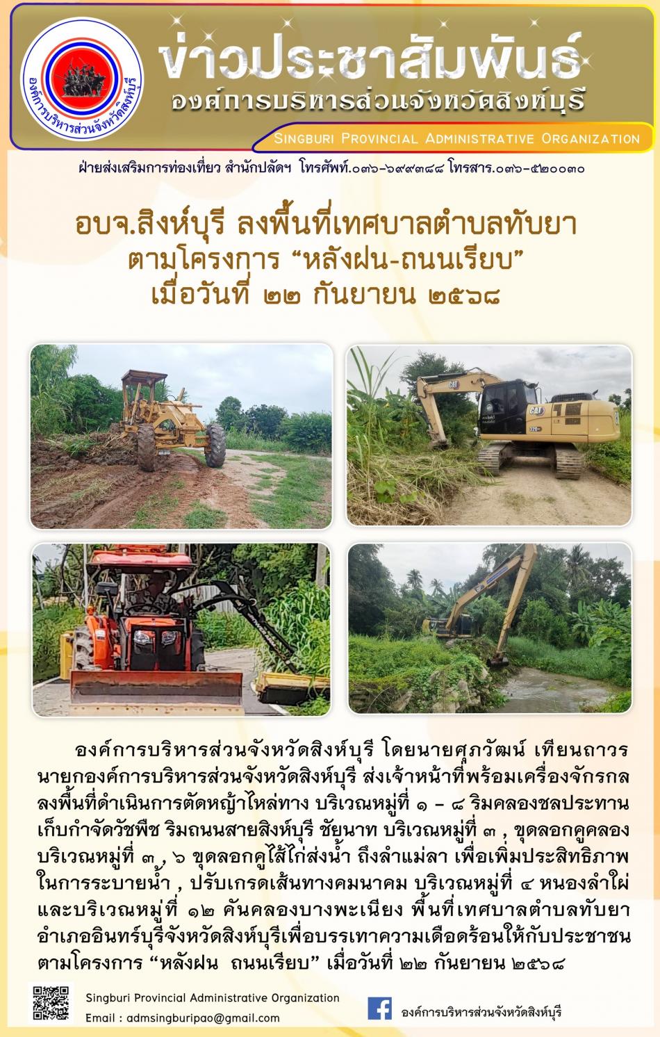 อบจ. สิงห์บุรี ลงพื้นที่ เทศบาลตำบลทับยา ตามโครงการ “ หลังฝน-ถนนเรียบ” [22 กันยายน 2568]