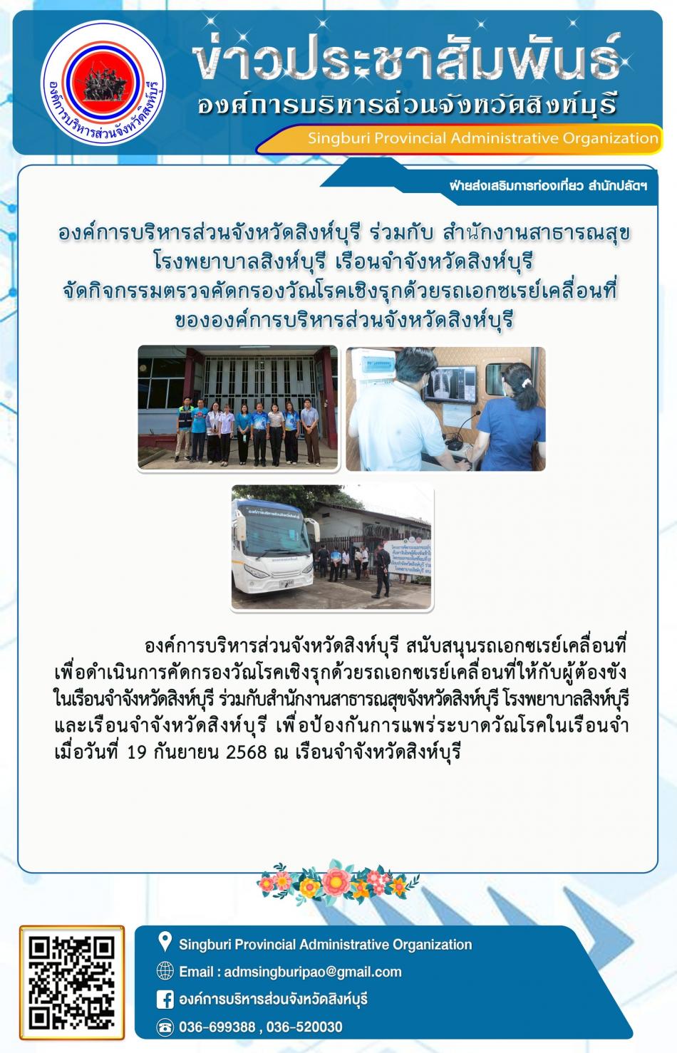 องค์การบริหารส่วนจังหวัดสิงห์บุรี ร่วมกับสำนักงานสาธารณสุข โรงพยาบาลสิงห์บุรี เรือนจำจังหวัดสิงห์บุรี จัดกิจกรรมตรวจคัดกรองวัณโรค เชิงรุกด้วยเครื่องเอ็กซเรย์เคลื่อนที่ขององค์การบริหารส่วนจังหวัดสิงห์บุรี [22 กันยายน 2568]