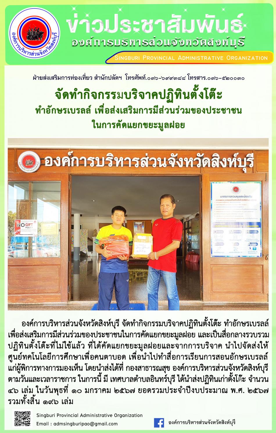 อบจ.สิงห์บุรี จัดทำกิจกรรม บริจาคปฏิทินตั้งโต๊ะทำอักษรเบรลล์ เพื่อส่งเสริมการมีส่วนร่วมของประชาชนในการคิดแยกขยะมูลฝอย [10 มกราคม 2567]