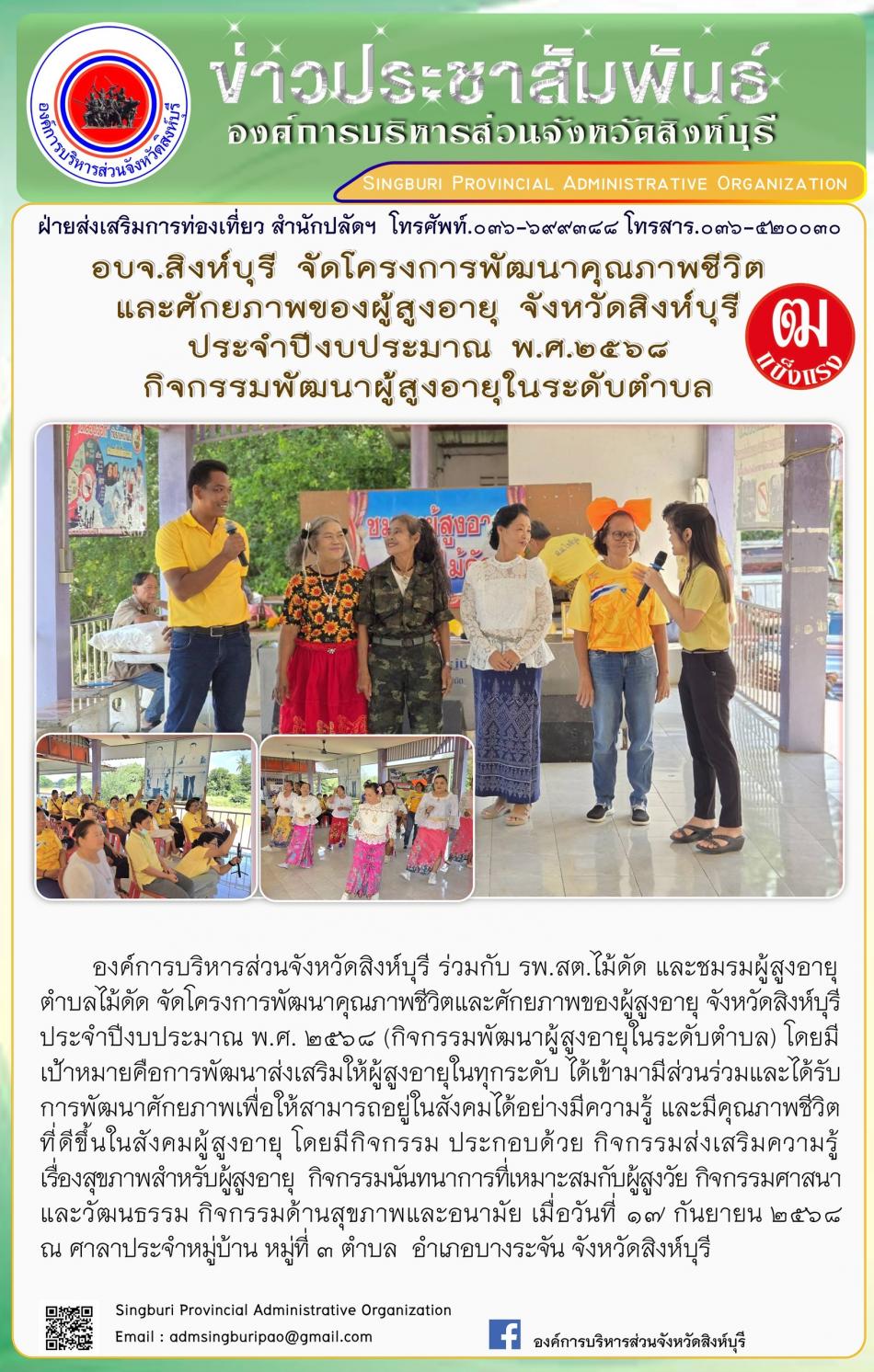 อบจ. สิงห์บุรี จัดโครงการพัฒนาคุณภาพชีวิตและศักยภาพของผู้สูงอายุ จังหวัด สิงห์บุรี ประจำประจำปีงบประมาณปี พ. ศ. 2568 กิจกรรมพัฒนาผู้สูงอายุในระดับตำบลกิจกรรมพัฒนาผู้สูงอายุในระดับตำบล [17 กันยายน 2568]