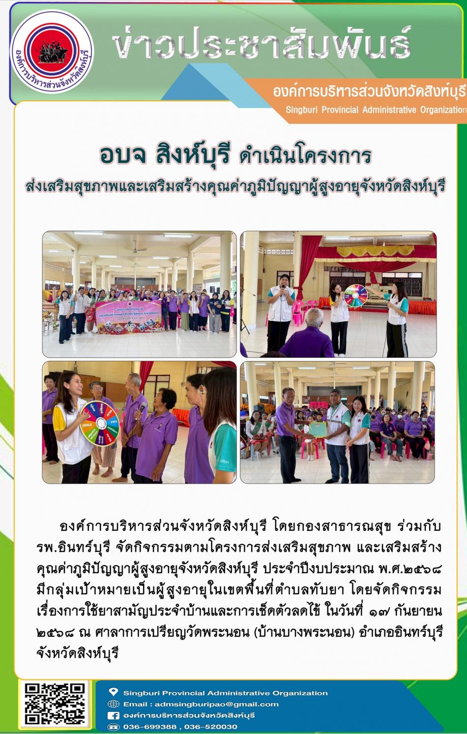 อบจ. สิงห์บุรี ดำเนินโครงการ ส่งเสริมสุขภาพและเสริมสร้างคุณค่าภูมิปัญญาผู้สูงอายุจังหวัดสิงห์บุรี [17 กันยายน 2568]