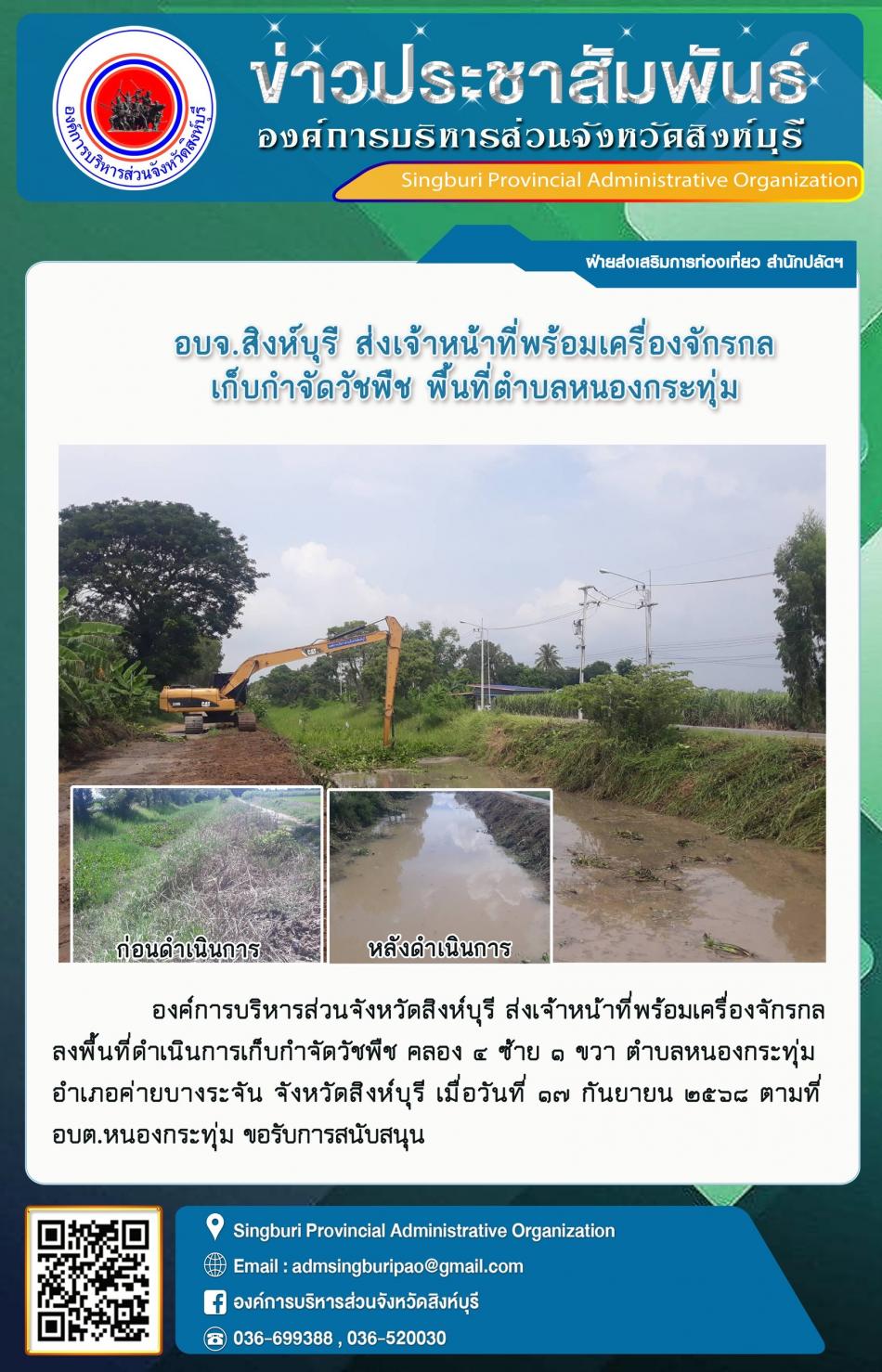 อบจ.สิงห์บุรี ส่งเจ้าหนังที่พร้อมเครื่องจักรกล เก็บกำจัดวันพืช พื้นที่ตำบลหนองกระทุ่ม [17 กันยายน 2568]