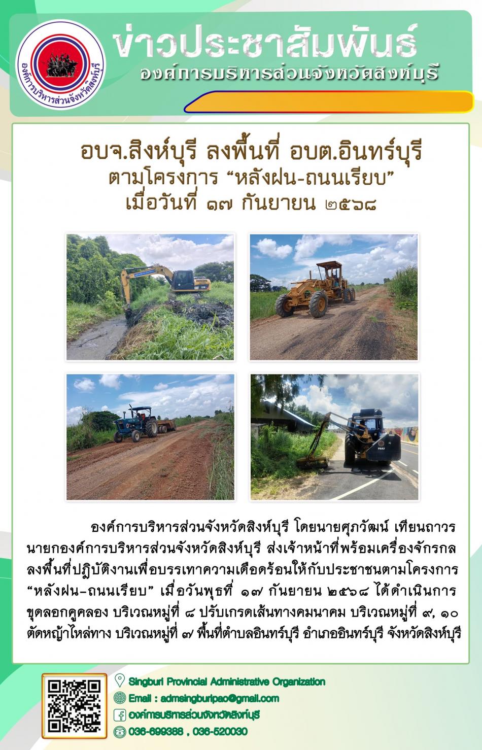 อบจ.สิงห์บุรี ลงพื้นที่ อบต. อินทร์บุรี ตามโครงการ “ หลัง ฝน- ถนนเรียบ” [17 กันยายน 2568]