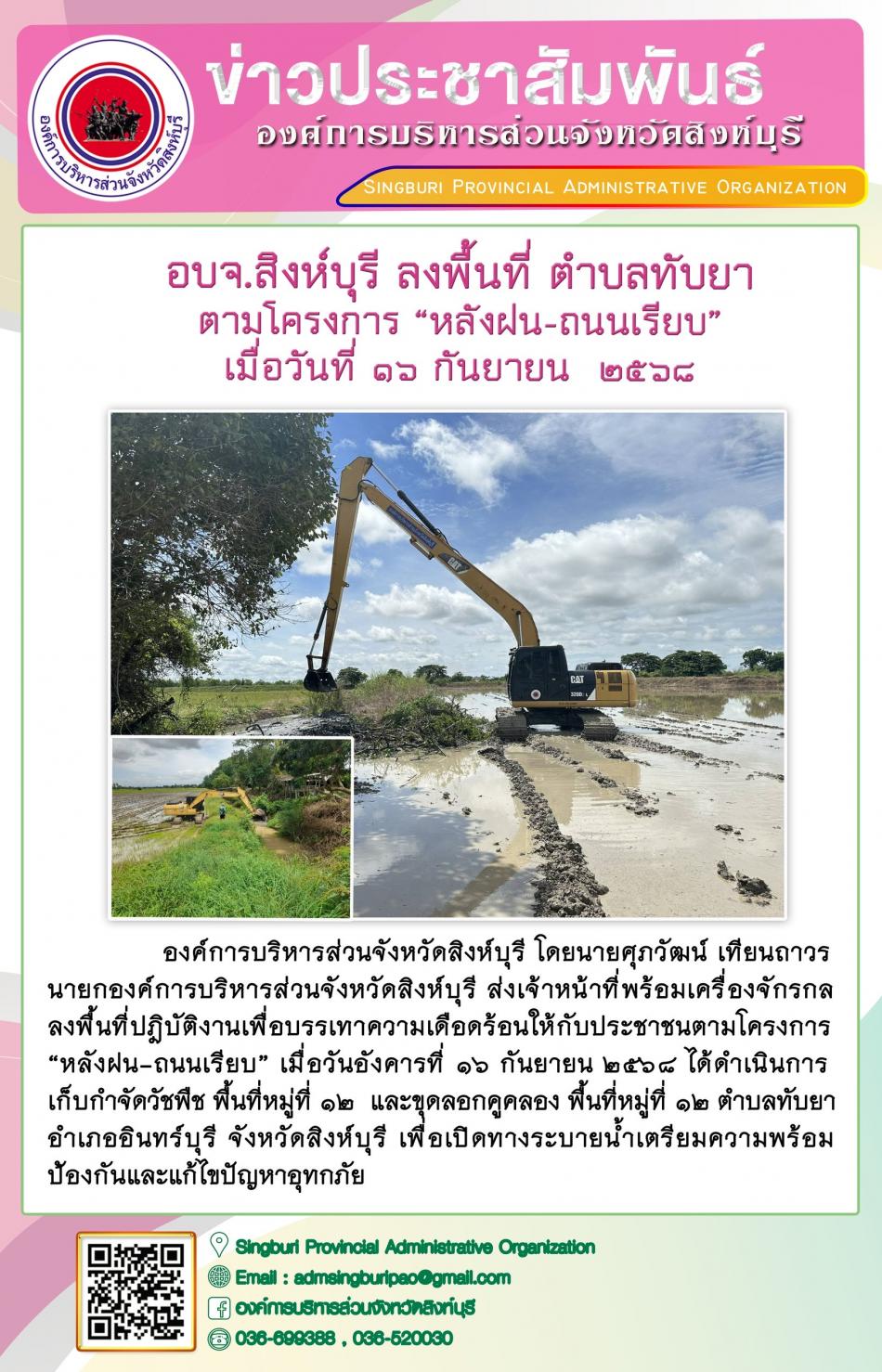 อบจ. สิงห์บุรี ลงพื้นที่ ตำบลทับยา ตามโครงการ “ หลังฝน-ถนนเรียบ” [16 กันยายน 2568]