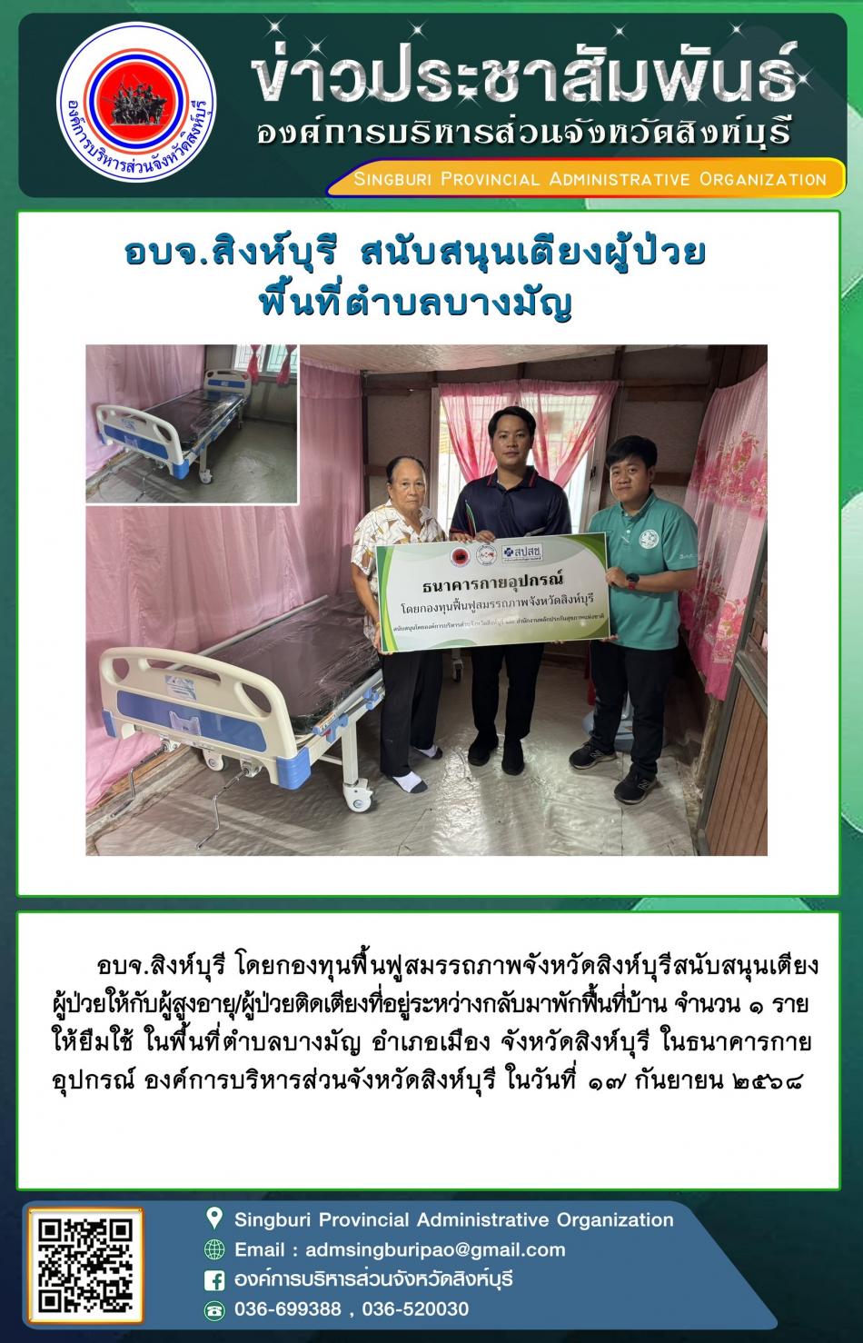อบจ. สิงห์บุรี สนับสนุนเตียงผู้ป่วย พื้นที่ตำบลบางมัญ [17 กันยายน 2568]