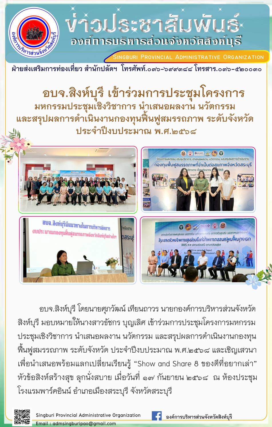 อบจ. สิงห์บุรี เข้าร่วมกวารประชุมโครงการมหกรรมประชุมเชิงวิชาการ นำเสนอผลงาน นวัตกรรมและสรุปผลการดำเนินงานกองทุนฟื้นฟูสมรรถภาพ ระดับจังหวัด ประจำปีงบประมาณ พ.ศ. 2568 [17 กันยายน 2568]