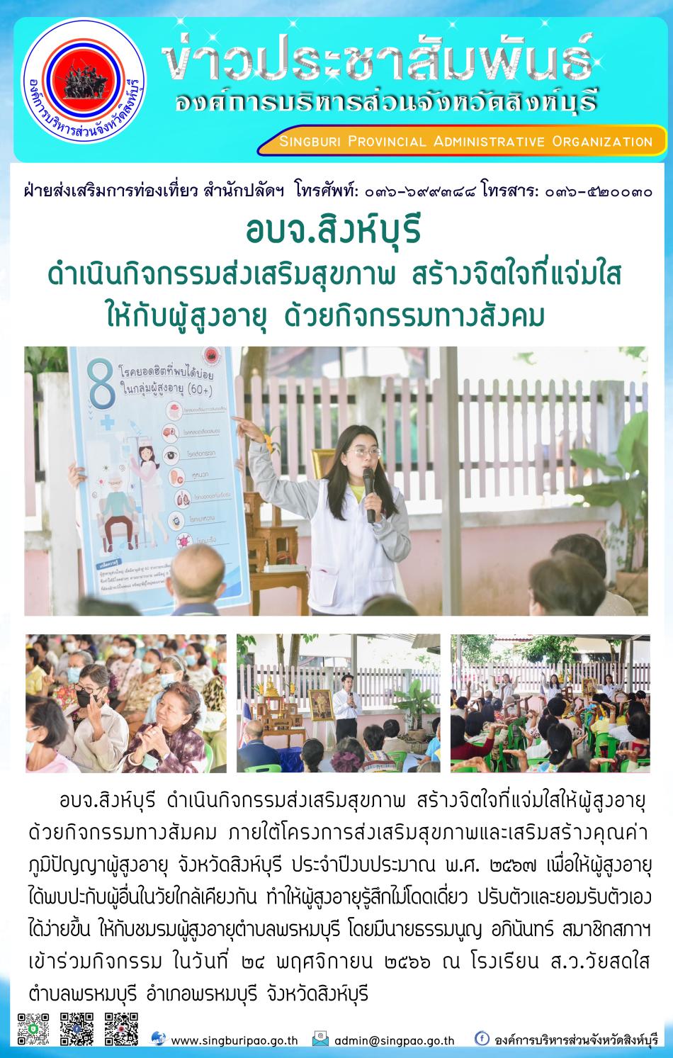 อบจ.สิงห์บุรี ดำเนินกิจกรรมส่งเสริมสุขภาพ สร้างจิตใจที่แจ่มใสให้กับผู้สุงอายุ ด้วยกิจกรรมทางสังคม [24 พฤศจิกายน 2566]
