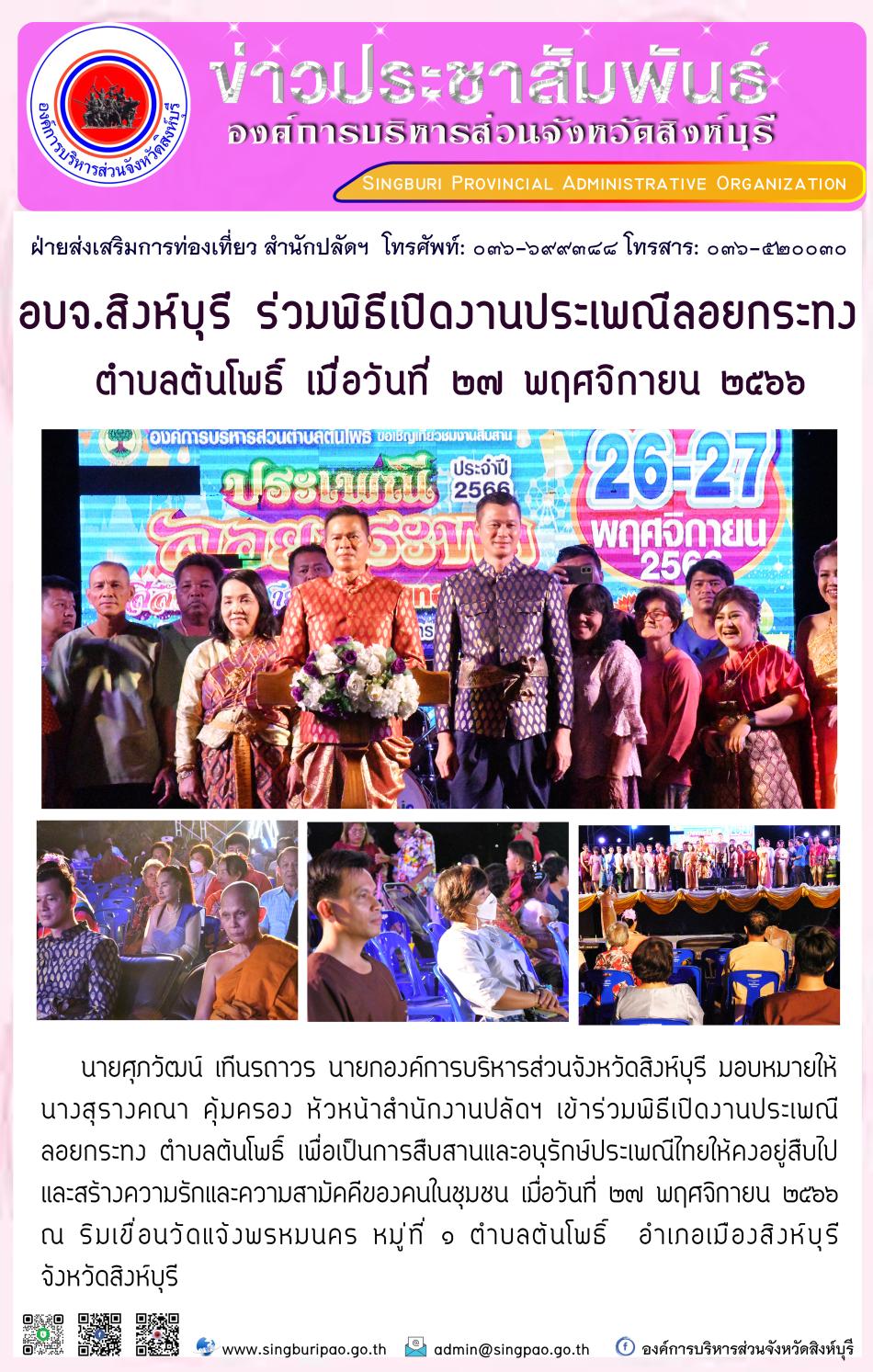 อบจ.สิงห์บุรี ร่วมพิธีเปิดงานประเพณีลอยกระทง ตำบลต้นโพธิ์ [27 พฤศจิกายน 2566]