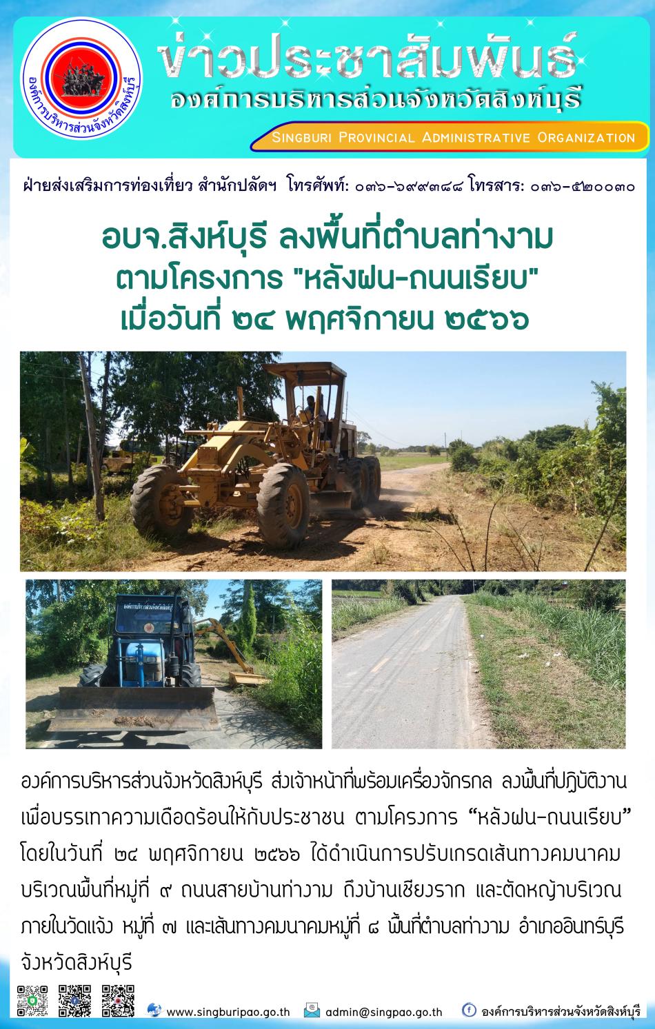 อบจ.สิงห์บุรี ลงพื้นที่ตำบลท่างาม ตามโครงการ "หลังฝน - ถนนเรียบ" [28 พฤศจิกายน 2566]