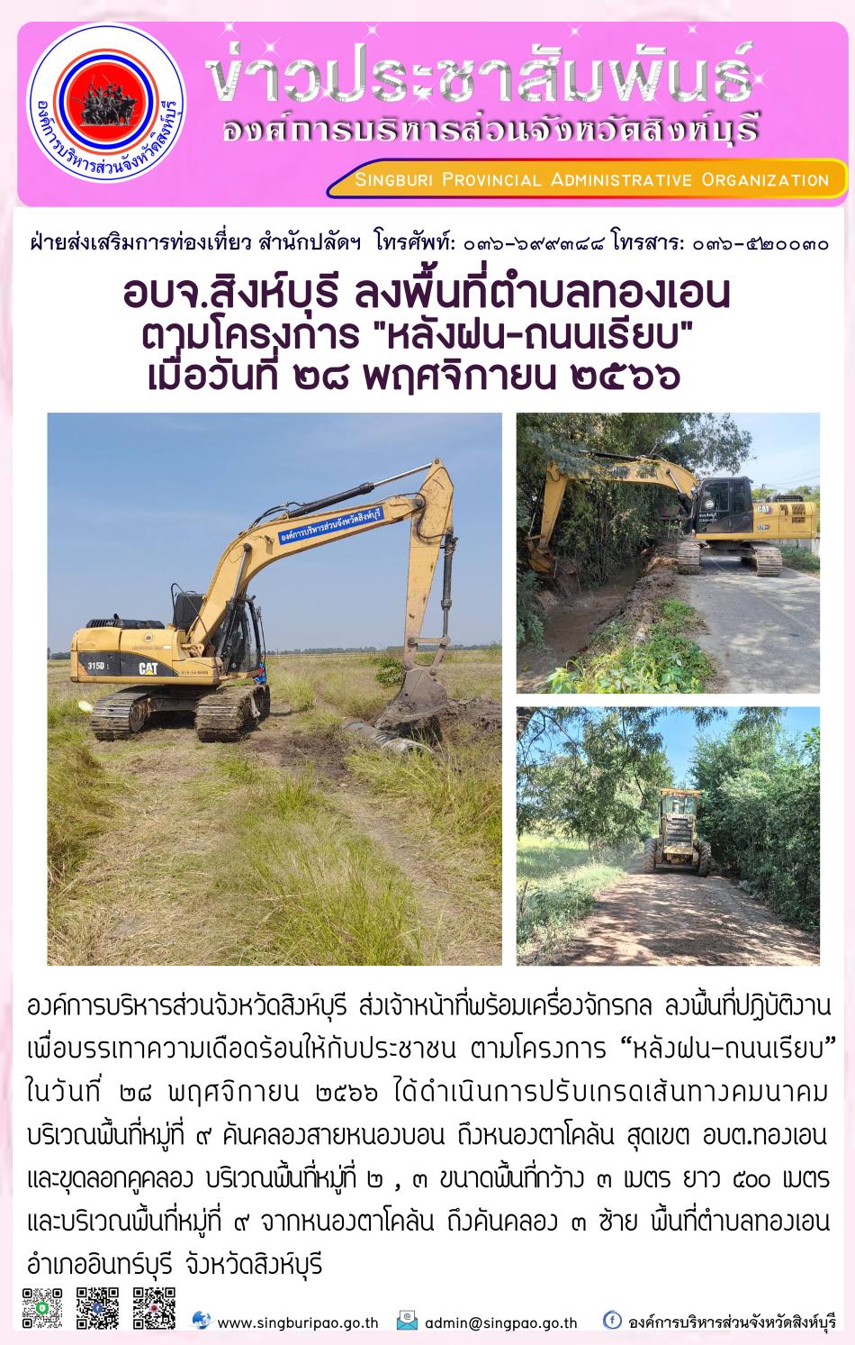 อบจ.สิงห์บุรี ลงพื้นที่ ตำบลทองเอน ตามโครงการ "หลังฝน - ถนนเรียบ" [28 พฤศจิกายน 2566]