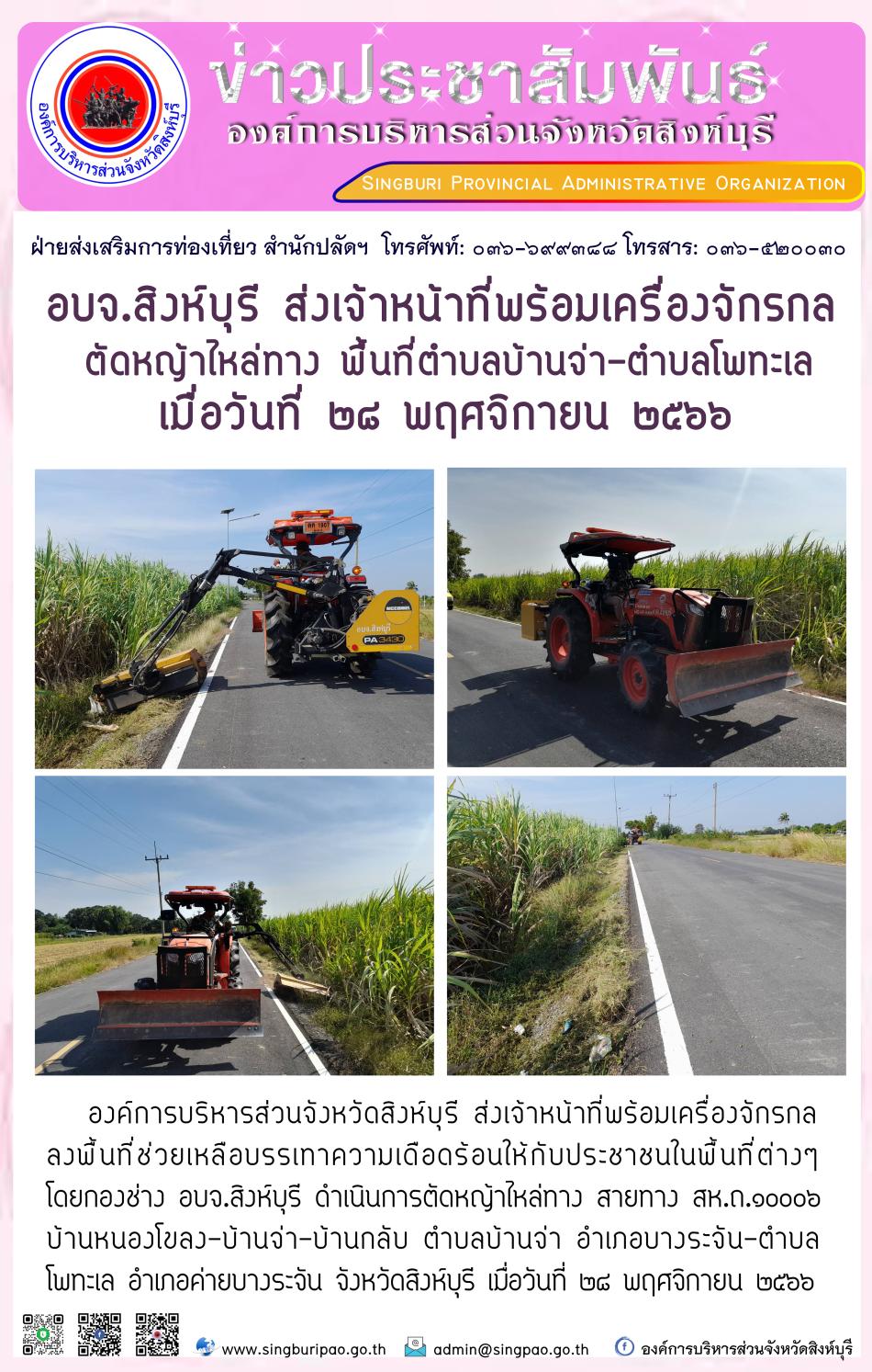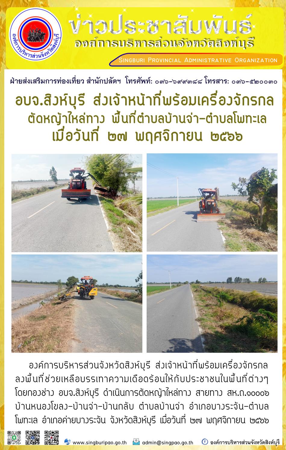 อบจ.สิงห์บุรี ส่งเจ้าหน้าที่พร้อมเครื่องจักรกล ตัดหญ้าไหล่ทาง พื้นที่ตำบลบ้านจ่า - ตำบลโพทะเล [27 พฤศจิกายน 2566]