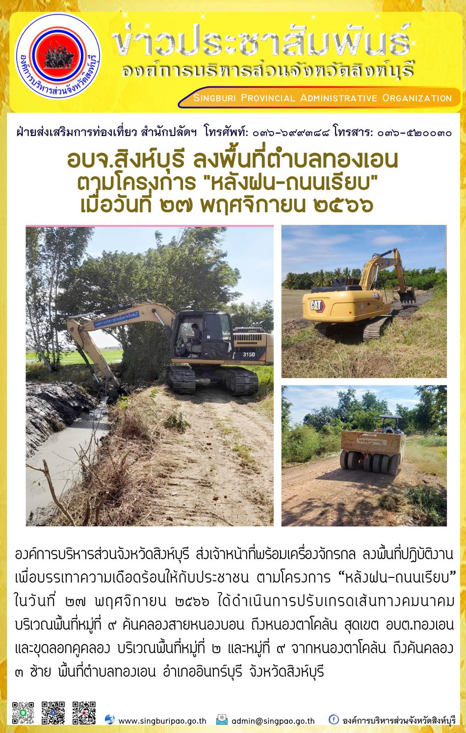 อบจ.สิงห์บุรี ลงพื้นที่ ตำบลทองเอน ตามโครงการ "หลังฝน - ถนนเรียบ" [27 พฤศจิกายน 2566]