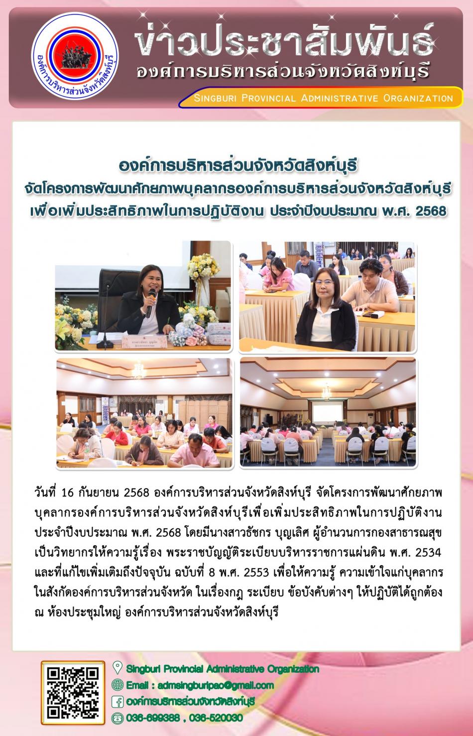 องค์การบริหารส่วนจังหวัดสิงห์บุรี จัดโครงการพัฒนาศักยภาพบุคลากรองค์การบริหารส่วนจังหวัดสิงห์บุรีเพื่อเพิ่มประสิทธิภาพในการปฏิบติงาน ประจำปีงบประมาณ พ.ศ. 2568 [16 กันยายน 2568]