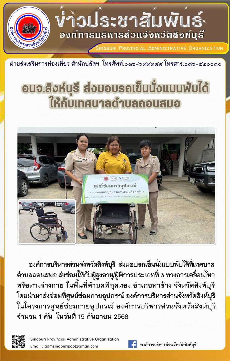 อบจ. สิงห์บุรี ส่งมอบรถเข็นนั่งแบบพับได้ให้กับเทศบาลตำบลถอนสมอ [15 กันยายน 2568]