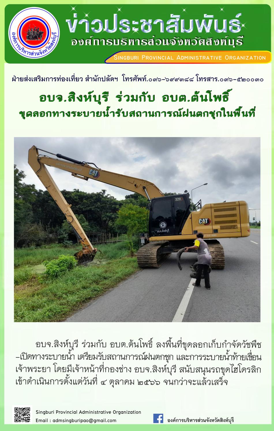 อบจ.สิงห์บุรี ร่วมกับ อบต.ต้นโพธิ์ ขุดลอกทางระบายน้ำรับสถานการณ์ฝนตกชุกในพื้นที่ [4 ตุลาคม 2566]
