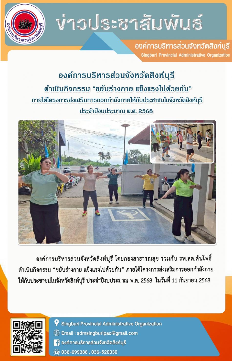 องค์การบริหารส่วนจังหวัดสิงห์บุรี ดำเนินกิจกรรม“ ขยับร่างกาย แข็งแรงไปด้วยกัน” ภายใต้โครงการดำเนินภายใต้โครงการ ส่งเสริมการออกกำลังกาย ส่งเสริมการออกกำลังกายให้กับประชาชนในจังหวัดสิงห์บุรี... [11 กันยายน 2568]