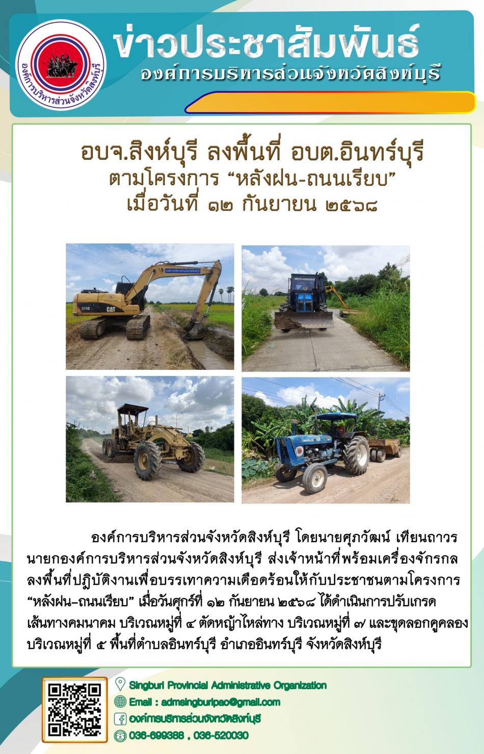 อบจ. สิงห์บุรี ลงพื้นที่ อบต.อินทร์บุรี ตามโครงการ “ หลังฝน-ถนนเรียบ” [12 กันยายน 2568]