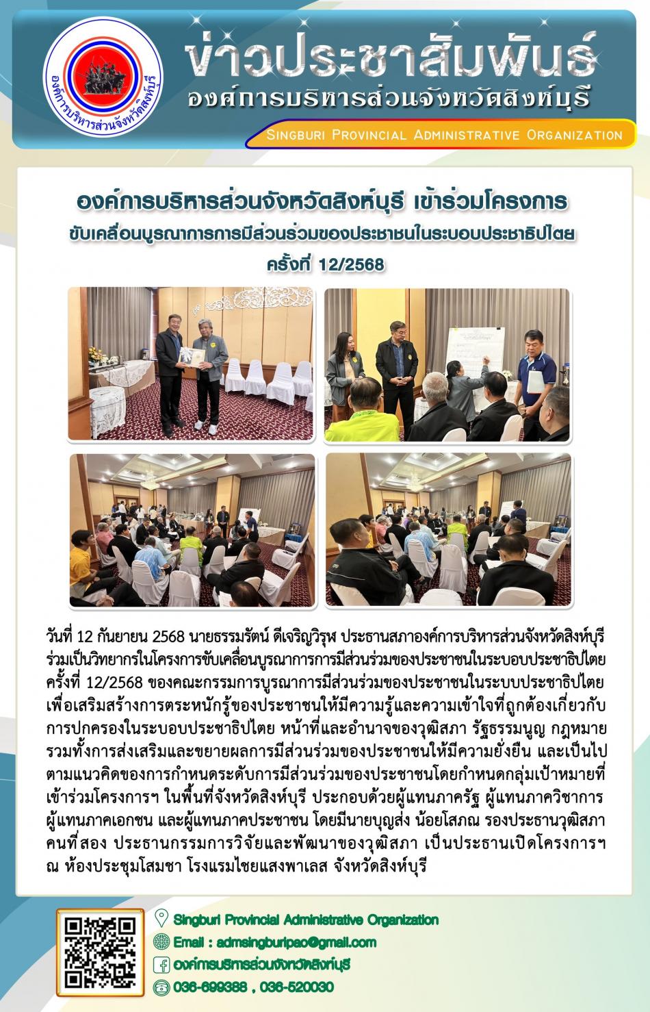 องค์การบริหารส่วนจังหวัดสิงห์บุรี เข้าร่วมโครงการขับเคลื่อนบูรณาการการมีส่วนร่วมของประชาชนในระบอบประชาธิปไตยครั้งที่ 12 / 2568 [12 กันยายน 2568]
