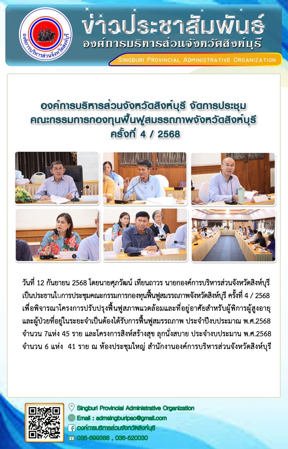 องค์การบริหารส่วนจังหวัดสิงห์บุรี จัดการประชุมคณะกรรมการกองทุนฟื้นฟูสมรรถภาพจังหวัดสิงห์บุรี ครั้งที่4 / 2568 [12 กันยายน 2568]
