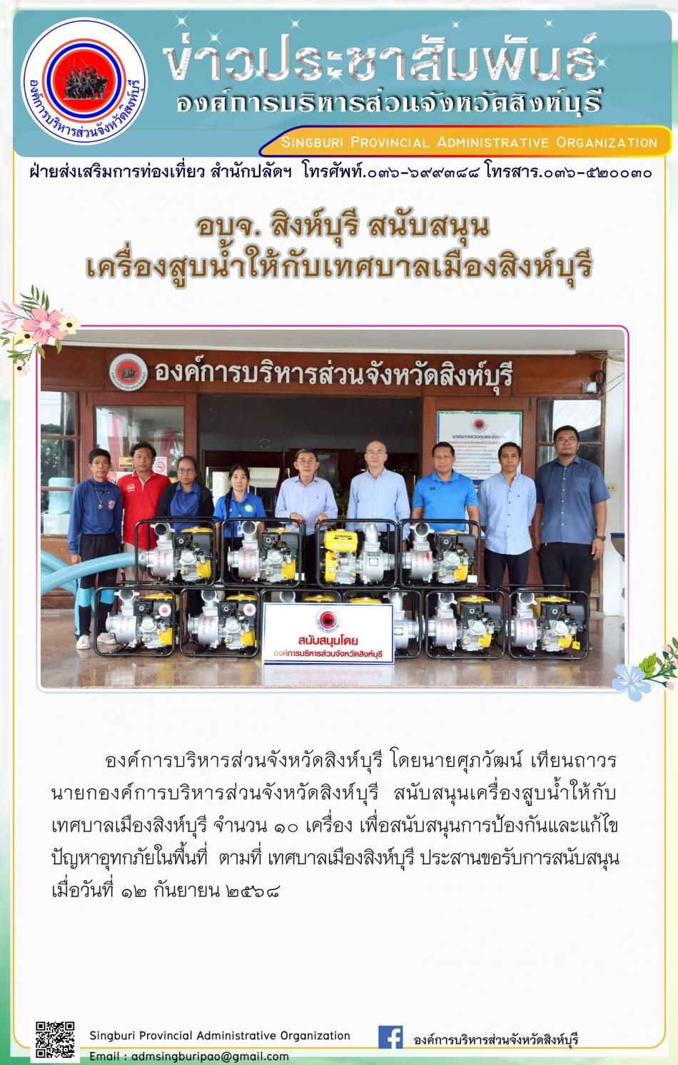 อบจ. สิงห์บุรี สนับสนุนเครื่องสูบน้ำให้กับเทศบาลเมืองสิงห์บุรี [12 กันยายน 2568]