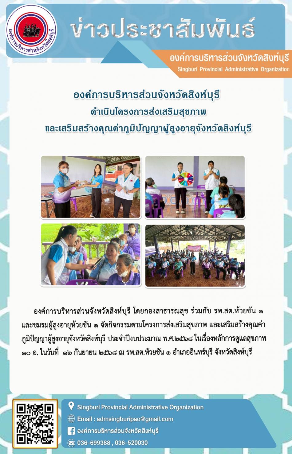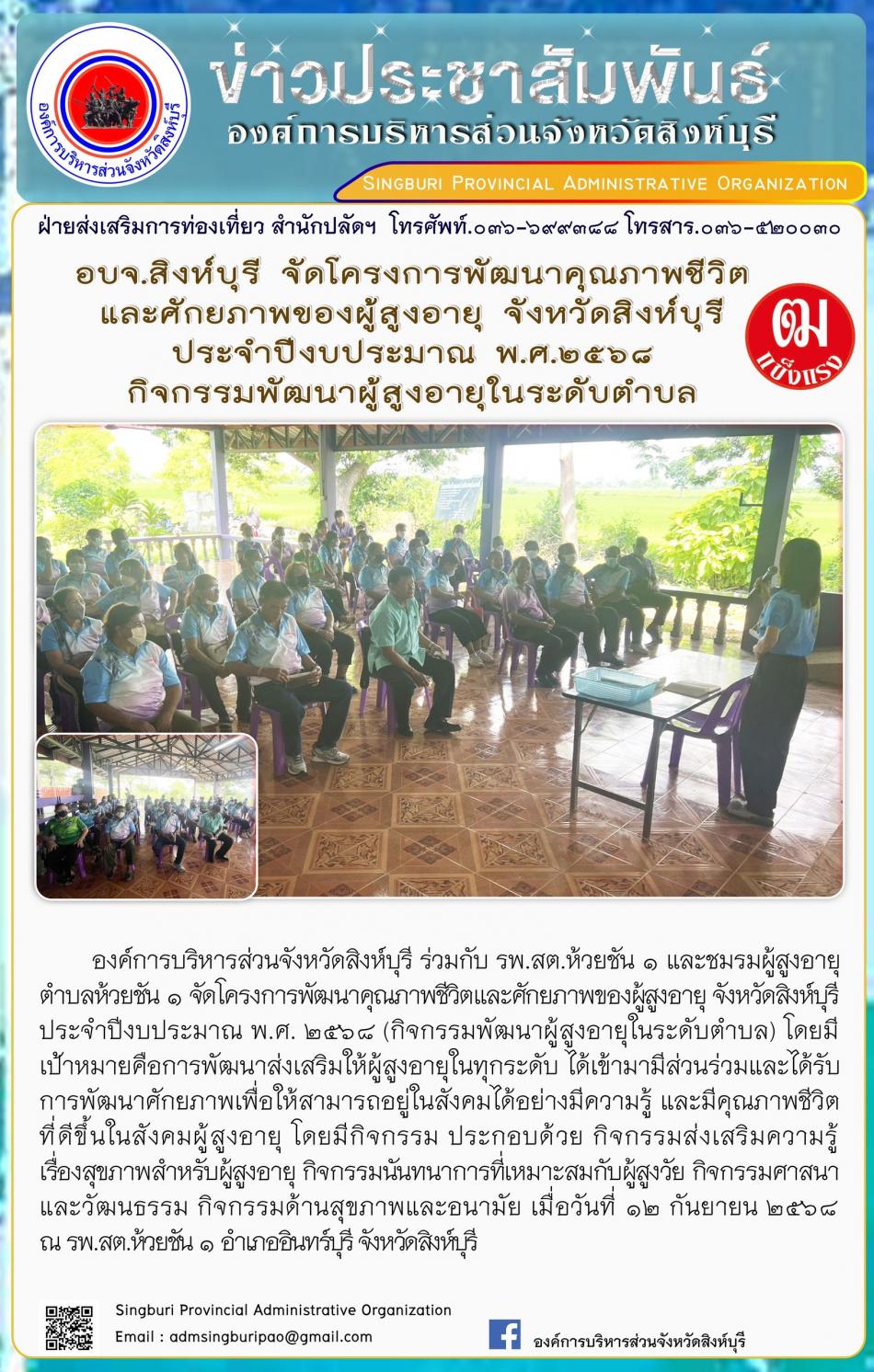 องค์การบริหารจังหวัดสิงห์บุรี ดำเนินโครงการ ส่งเสริมสุขภาพและเสริมสร้างคุณค่าภูมิปัญญาผู้สูงอายุจังหวัดสิงห์บุรี [12 กันยายน 2568]