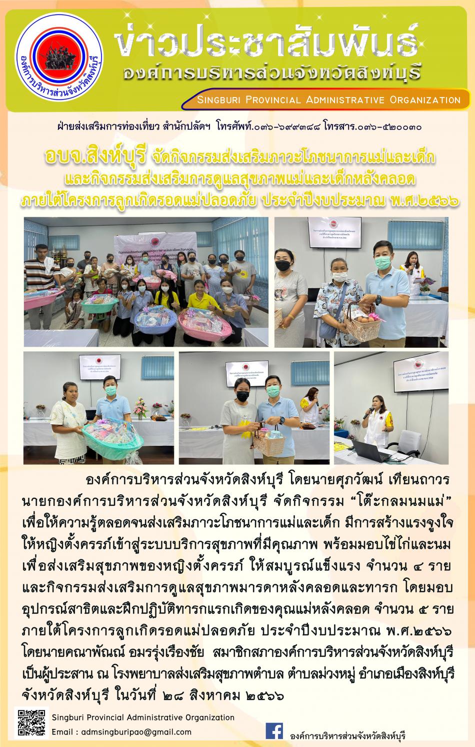 อบจ.สิงห์บุรี จัดกิจกรรมส่งเสริมภาวะโภชนาการแม่และเด็กและกิจกรรมส่งเสริมการดูแลสุขภาพแม่และเด็กหลังคลอดภายใต้โครงการลูกเกิดรอดแม่ปลอดภัย ประจำปีงบประมาณ พ.ศ.2566 [28 สิงหาคม 2566]