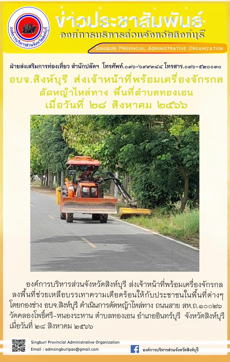 อบจ.สิงห์บุรี ส่งเจ้าหน้าที่พร้อมเครื่องจักรกลตัดหญ้าไหล่ทาง พื้นที่ตำบลทองเอน [28 สิงหาคม 2566]