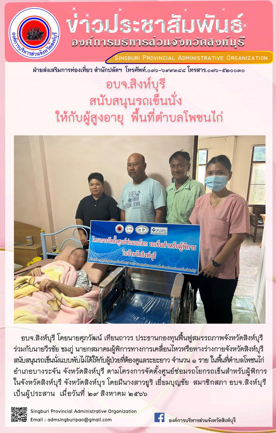 อบจ.สิงห์บุรี สนับสนุนรถเข็นนั่งแบบมาตรฐาน ให้กับผู้สูงอายุ พื้นที่ตำบลโพชนไก่ [29 สิงหาคม 2566]